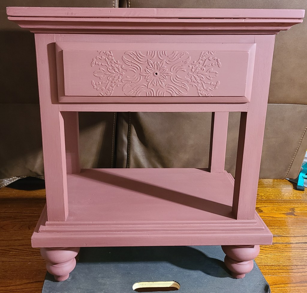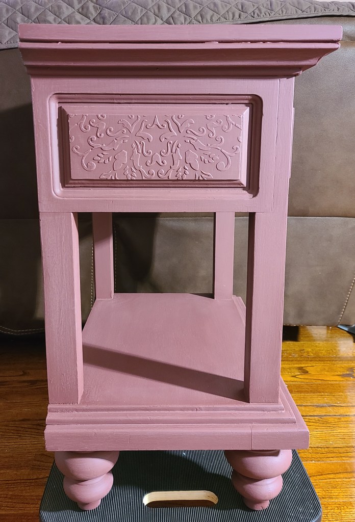 I applied a thin coat of Dixie Belle’s chalk paint in the color Muscadine Wine using an angle Wooster brush. These brushes are very inexpensive and will get the job done but if you have a few extra $$ get a better-quality synthetic brush. The paint was already dry to the touch when I was done, so I applied the second coat right after the first. Your dry time may vary due to the climate you are in but for the most part chalk paint dries very quickly. I love the muscadine wine color but felt it was just too plain for this piece.