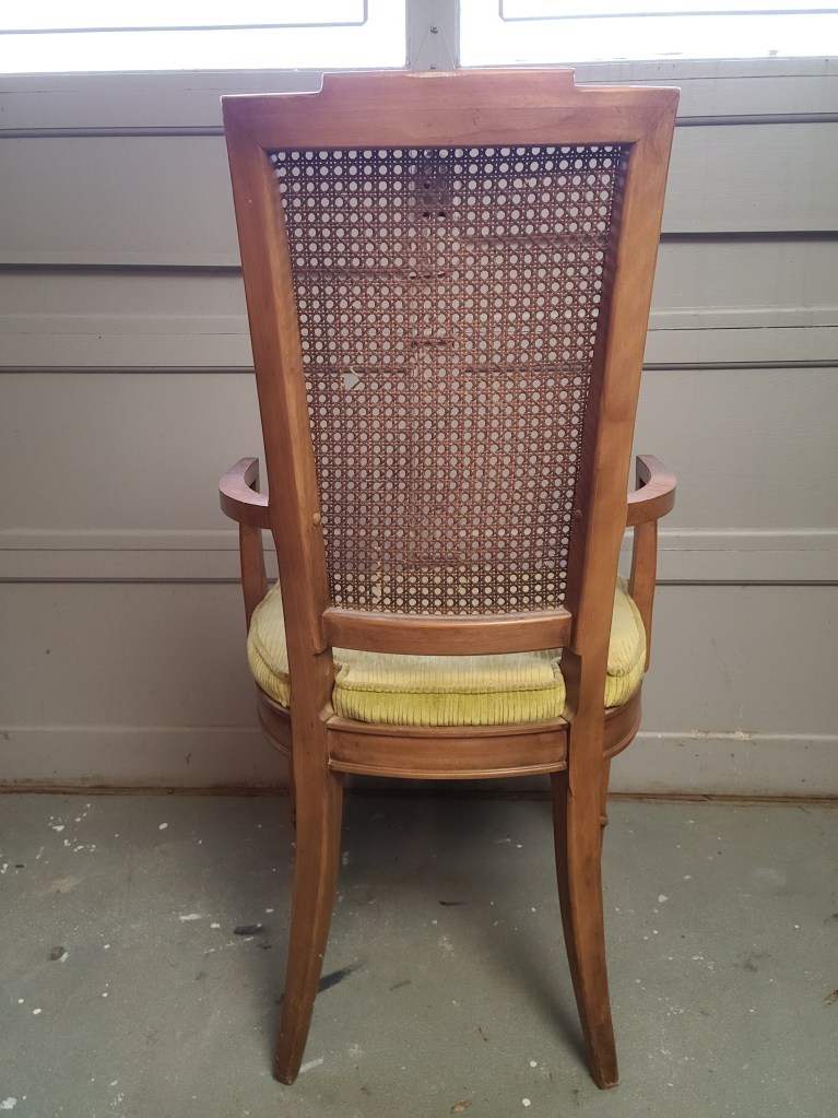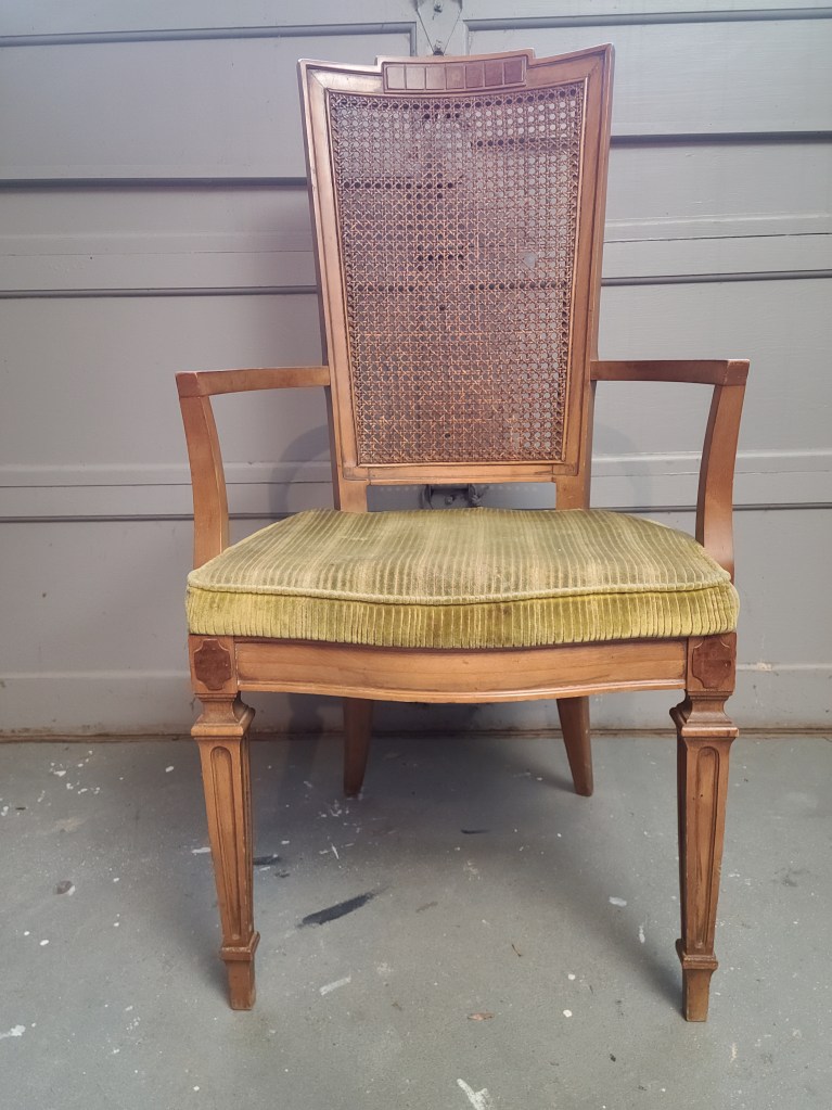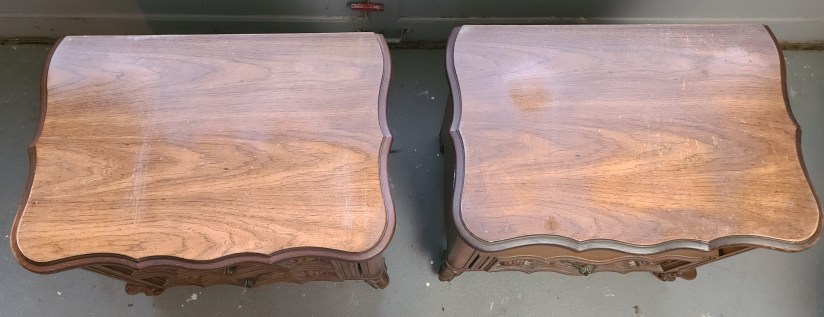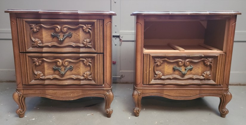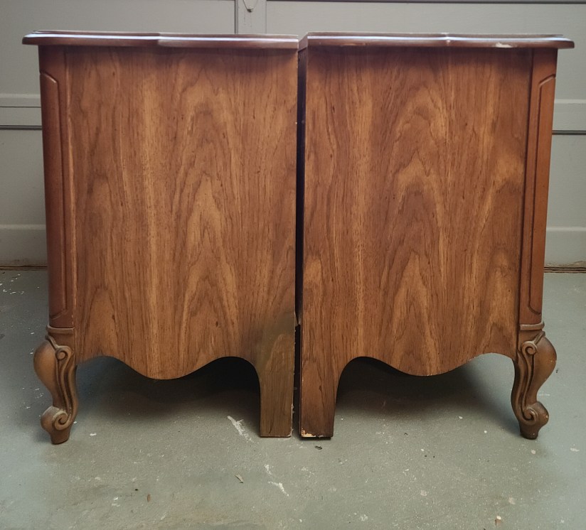 Three-piece 1970’s French provincial bedroom set. Draw is missing and will be converted into a shelf. These nightstands are 25 inches tall, 11 3/4 inches long and 16 inches wide.