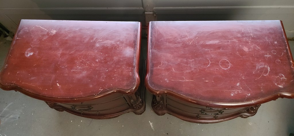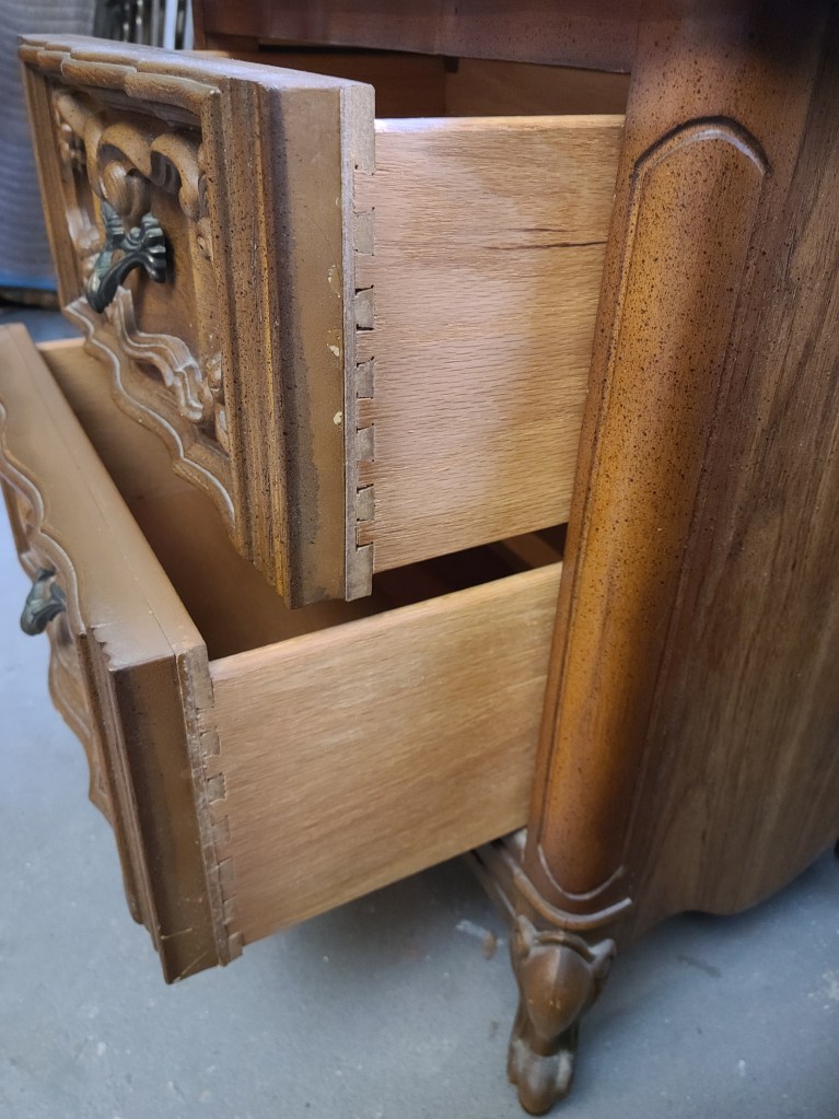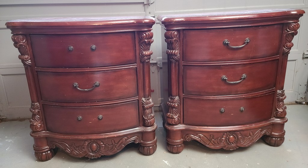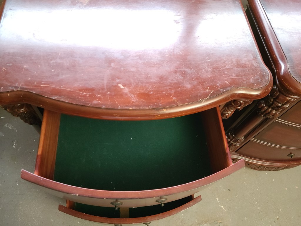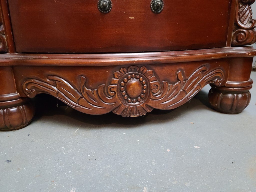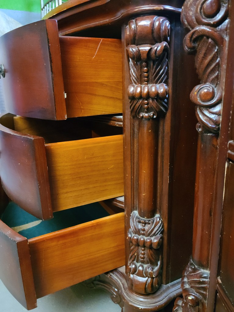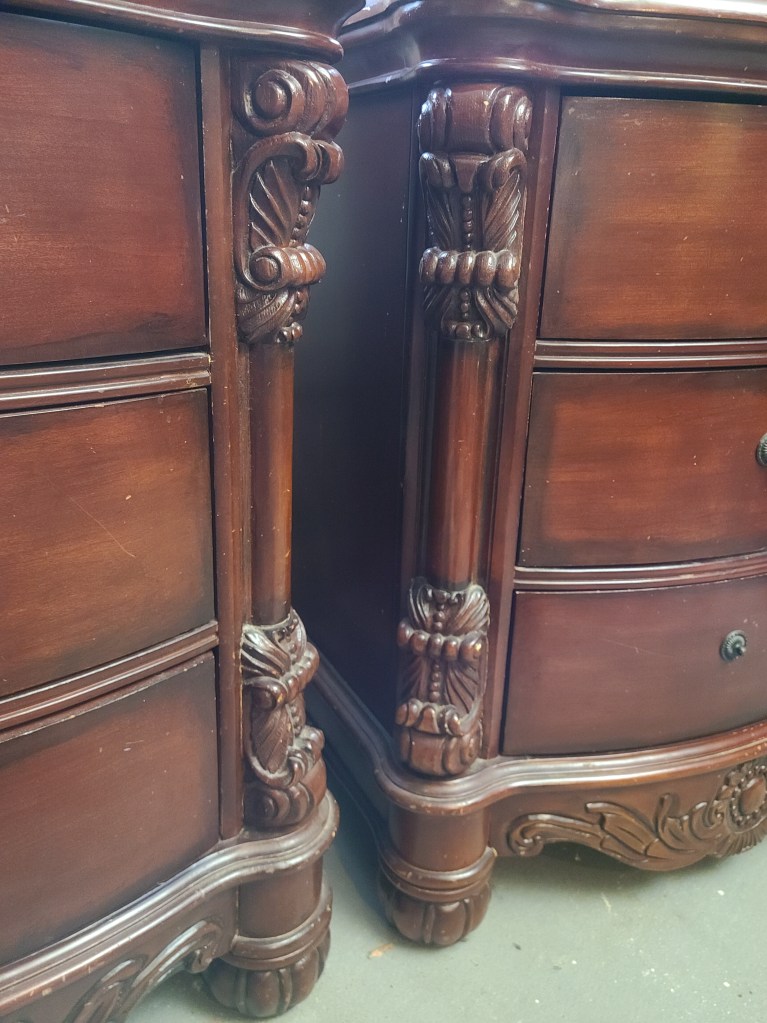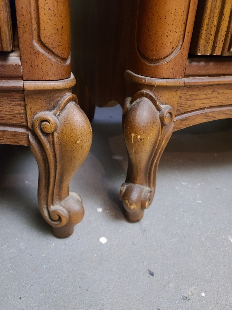 These two pieces have amazing details awaiting to shine through. Handles will have to be replaced as 3 are missing. These beauties stand at 33 1/4 inches tall, are 31 inches long, and 19 inches wide.