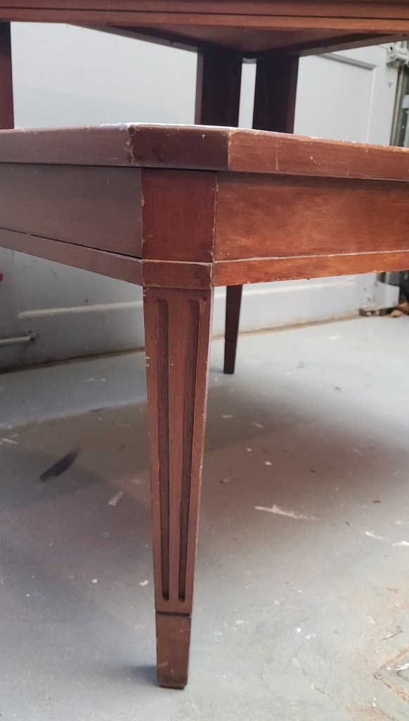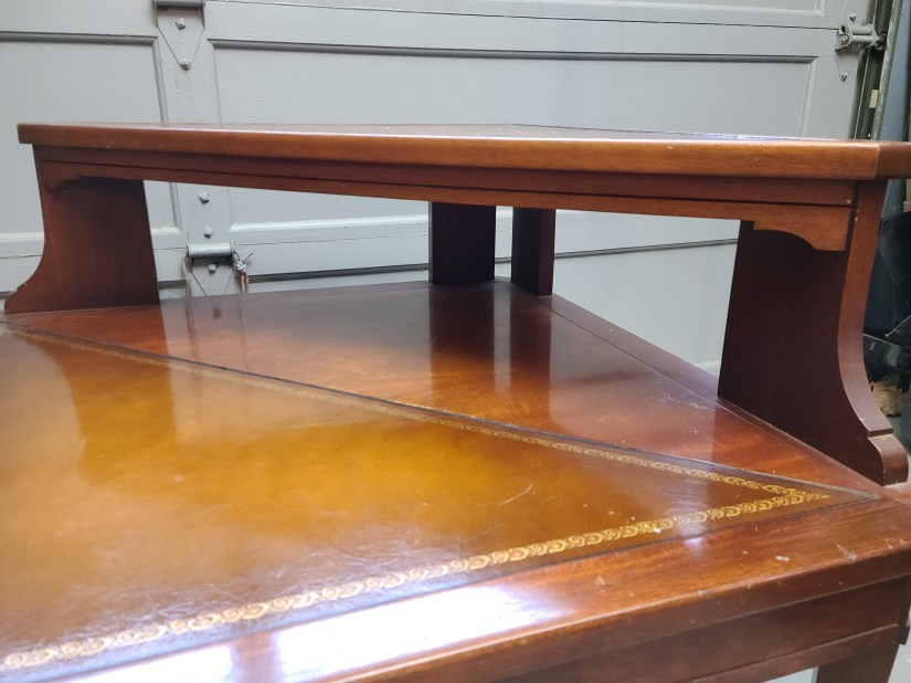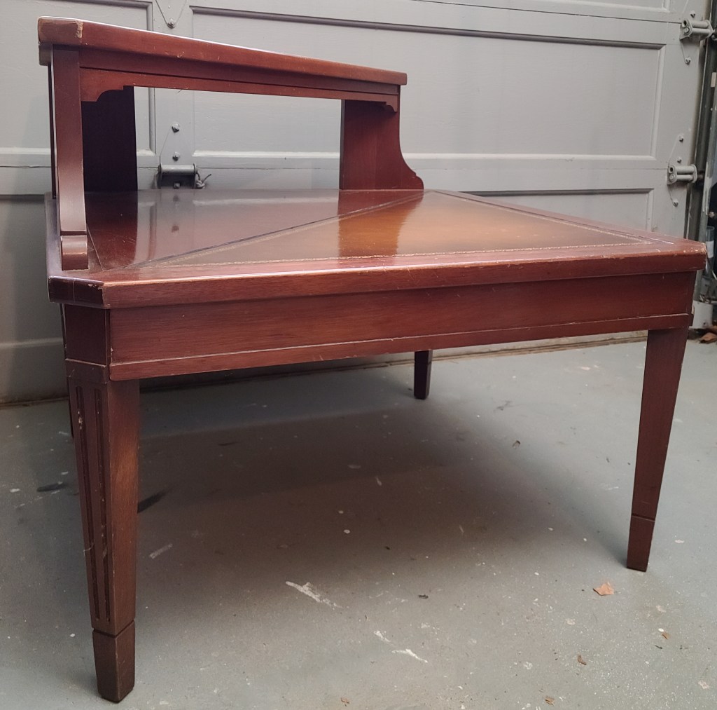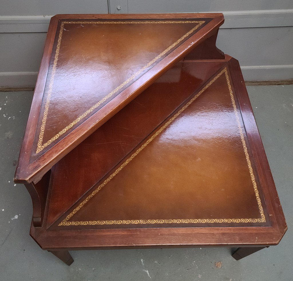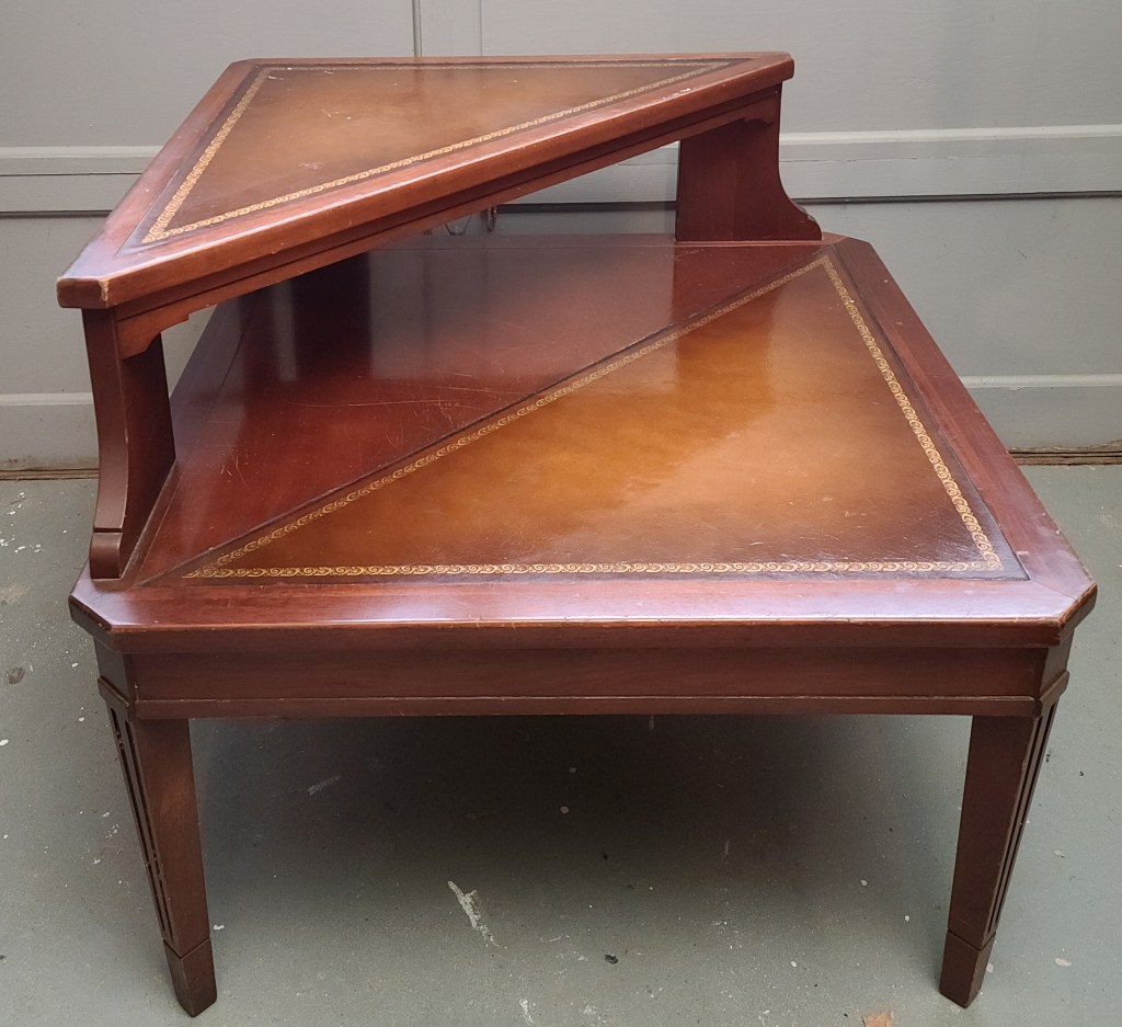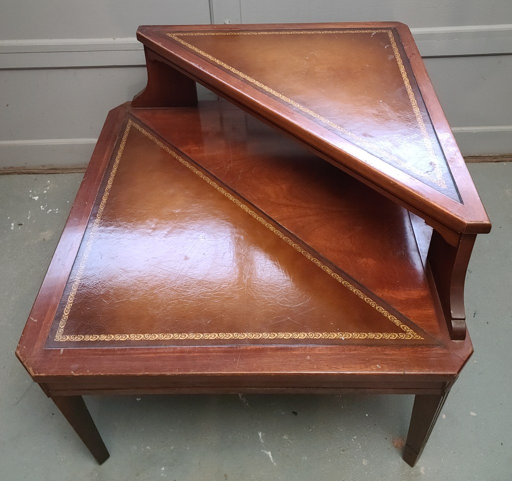 Two-tier, all wood, square corner table. Measures 30 inches long and wide, and 26 inches in height.