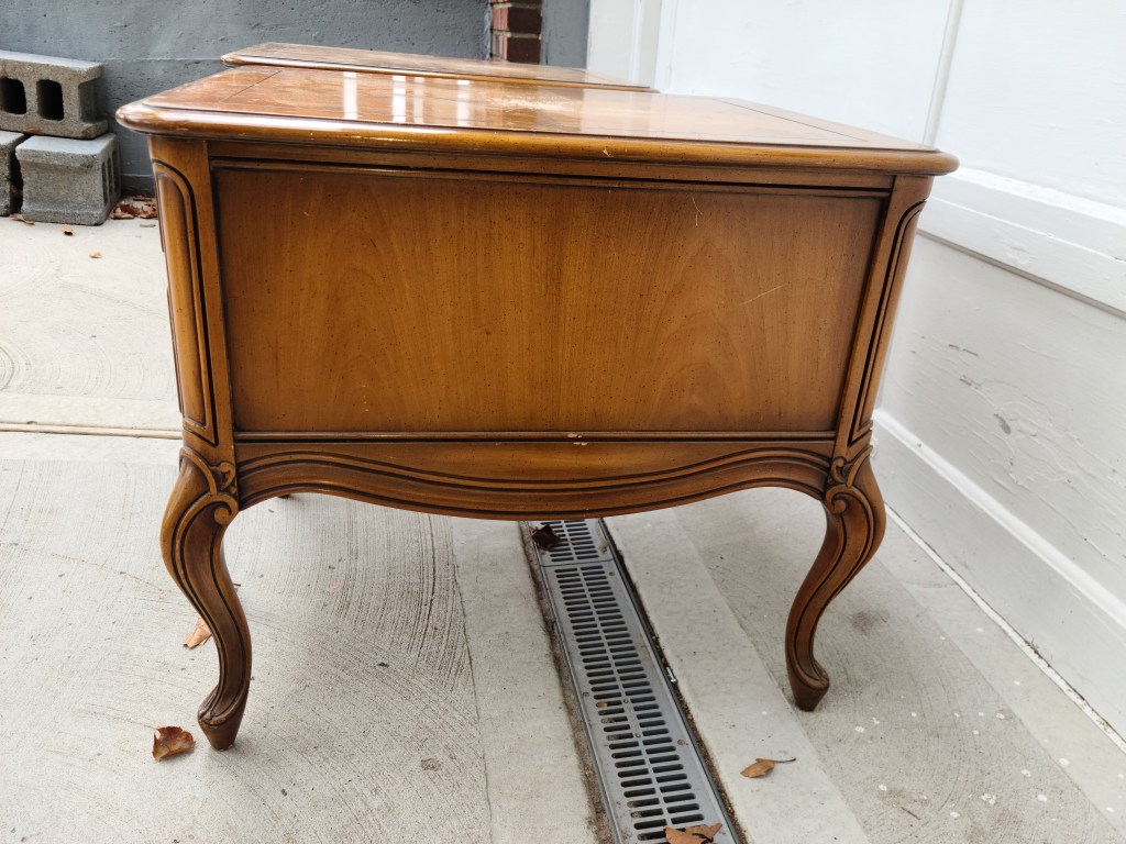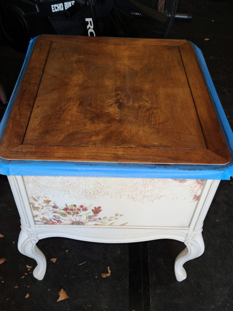 By looking at tops of the piece you can tell that there is veneer on them. Wood does not naturally make those shapes you see in the middle, so if you do not see wood grain going in one single direction, that is a clear indicator that its veneer. Because I didn’t want to blow through the veneer sanding off the finish, I used Klean Strip Premium Stripper. This was my first time using this stuff and it STINKS! Make sure to use this in a well-ventilated area or outside. I left on for about 10 -15 minutes and then used a plastic putty knife to scrape off. I did not do this, but you can put cerium wrap or plastic bags over the stripper to prevent it from drying. It will be very difficult to remove the stripper if it dries. After removing the stripper, wipe the areas with mineral spirits. I went ahead and started sanding the tops with my orbital sander and using 80grit. Because I did not fully remove the stripper, it started to eat up my sandpaper. It looked like there were just little chunks on the paper, when this happens it will prevent the paper from actually doing its job and it will not sand anything, so make sure to not let your stripper dry and remove all of it. I had to pretty much keep switching my sandpaper till it all came out and then was able to actually sand the tops. I then hand sanded the tops with a 120grit sanding sponge. I also scuff sanded the rest of the piece with a 220 sanding sponge.