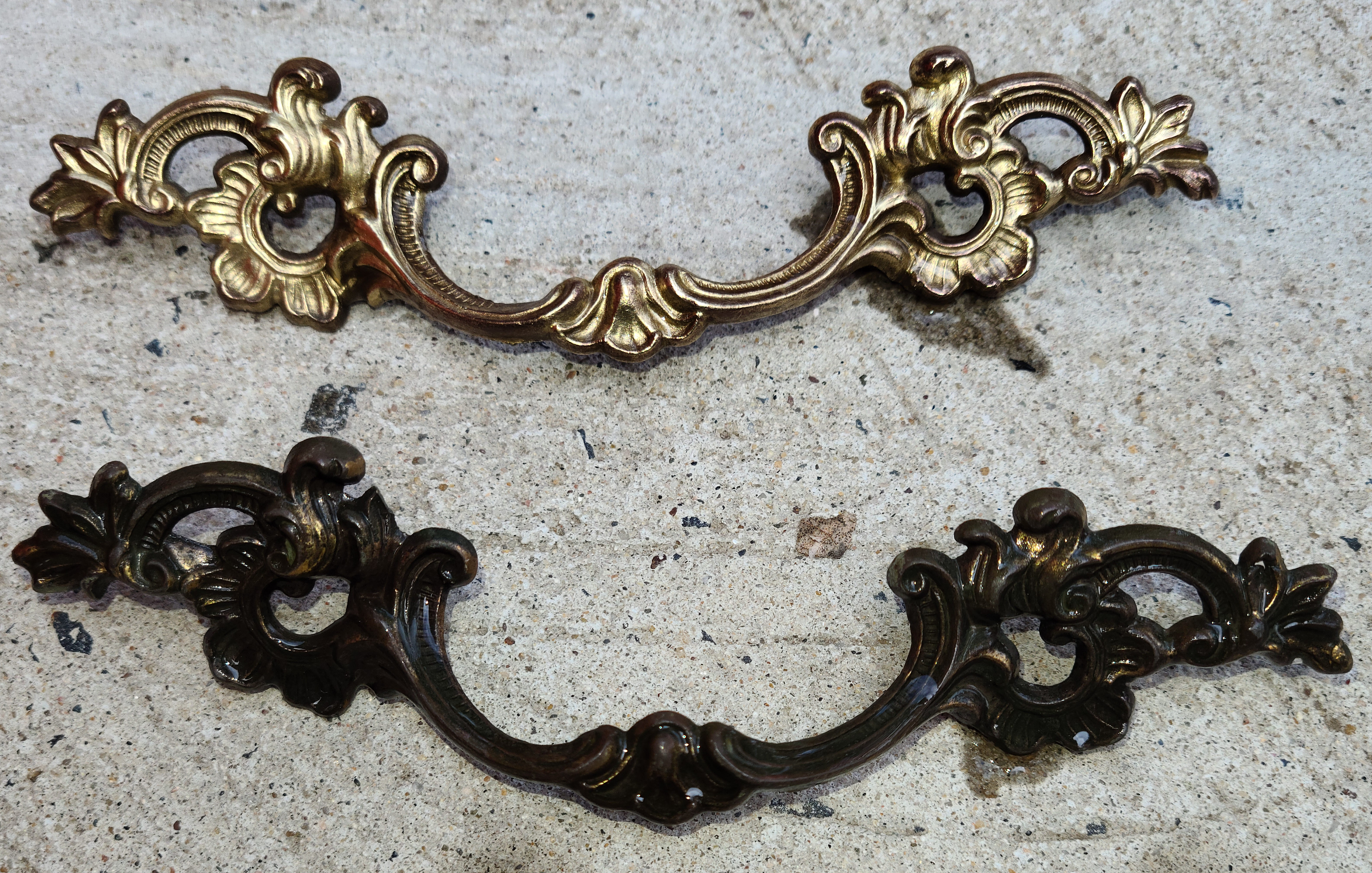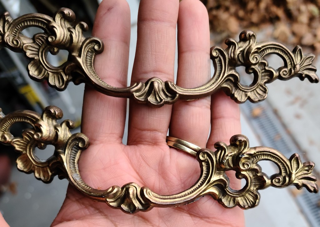 Starting with Dixie Belle’s White Lightening cleaner, I gave these two a good clean. All you need is a little bit of the cleaner mixed with warm water. Make sure to wipe your furniture with a clean rag and plain warm water after cleaning to get any remaining cleaner off your piece. Before starting to clean I dropped the hardware pulls into the bucket of water with the cleanser and allowed it to soak while I wiped down both pieces. By the time I was done cleaning the pieces the hardware had enough time to soak and I was able to easily clean the pulls using a brass wire brush.