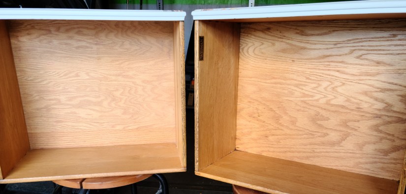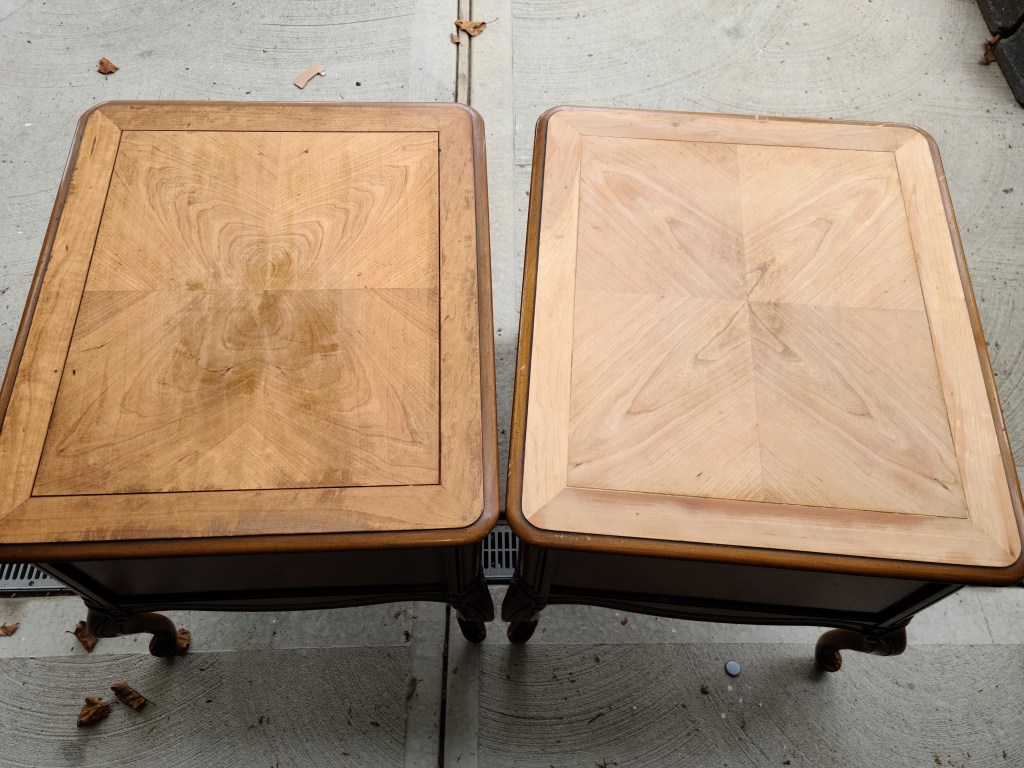 This photo was taken after the stripper was removed. The piece on the right was sanded and the one on the left was not. You can actually see spots on the left, these were areas where the stripper was not fully removed from the piece. You can also see that I blew through the veneer on the table to the right. If you look towards the bottom there is a dark line, yea I sanded too much in the area and guess what, there’s no fixing so try not to do that.