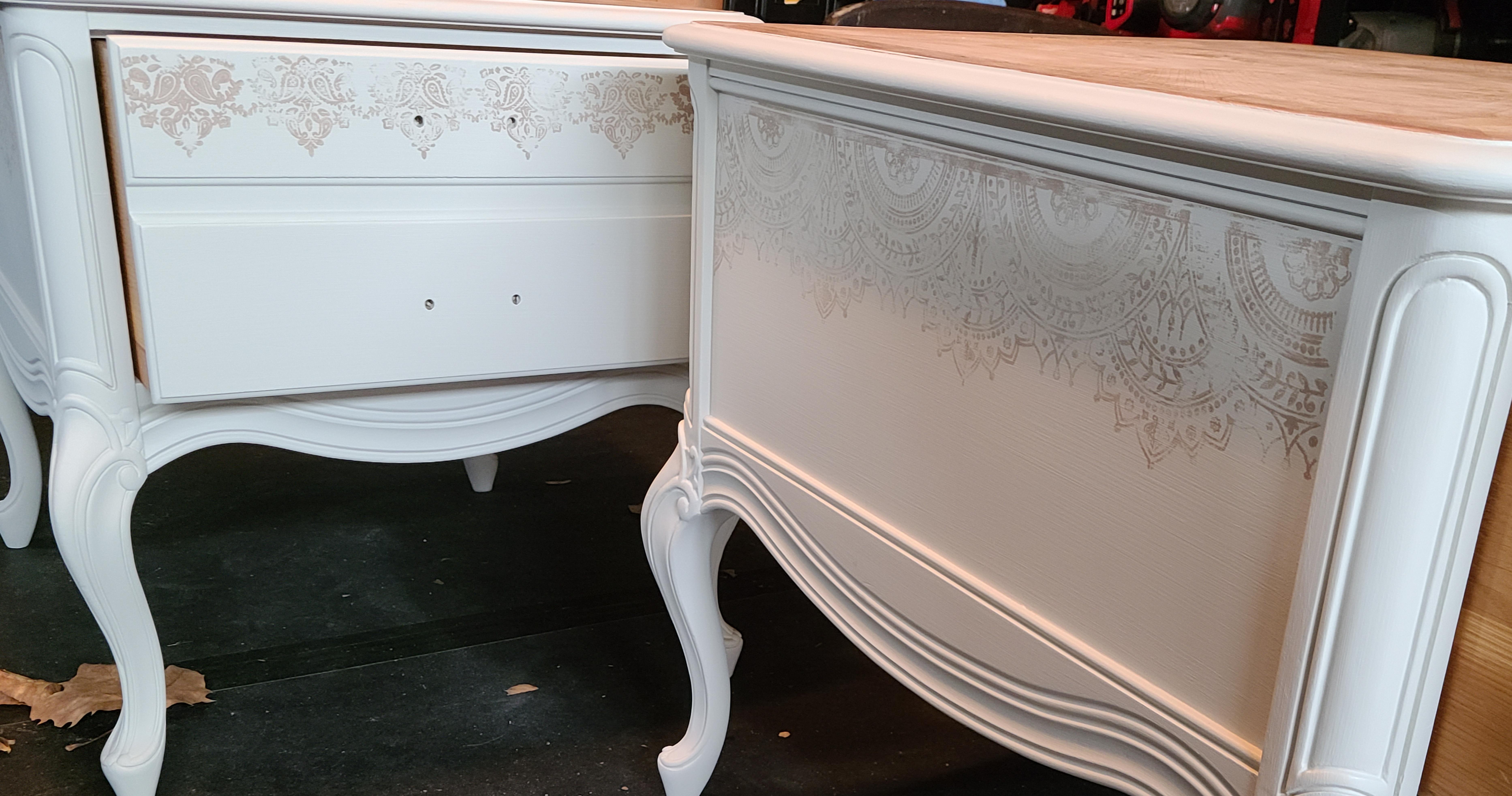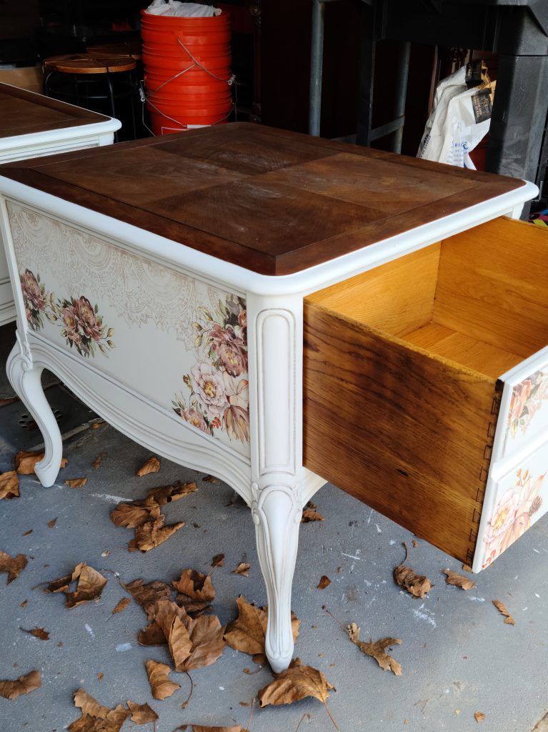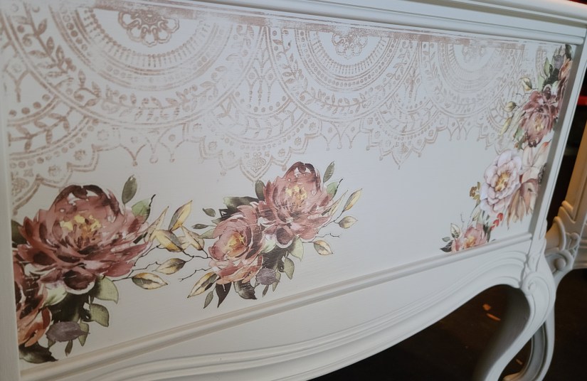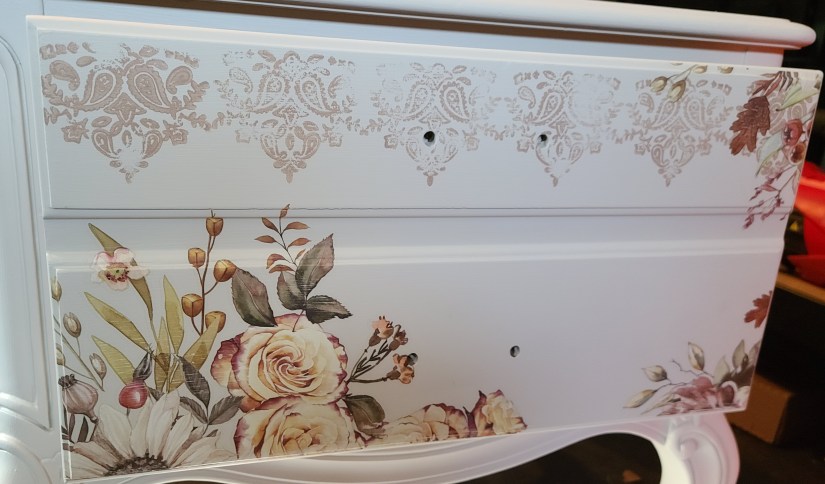 After the paint was fully dry, I started stamping my piece. Before placing my stamp, I realized here that maybe using the silk all in one paint may have not been the best choice when layering on a piece. Why? Because it has a topcoat and paint needs something to stick to so now, I had to lightly scuff sand the areas I was placing my stamp on to make sure my chalk paint would adhere properly and not ship off. Anyways, I mixed Dixie Belle’s chalk paint in the color mud puddle with just a little bit of caviar to darken it. I placed this paint on Redesign with Prima’s Bohemian Floral stamp using their acrylic block and foam roller. I used two different stamps to stamp the draws and around the entire two pieces. These rubber stamps give off a beautiful natural distress look.