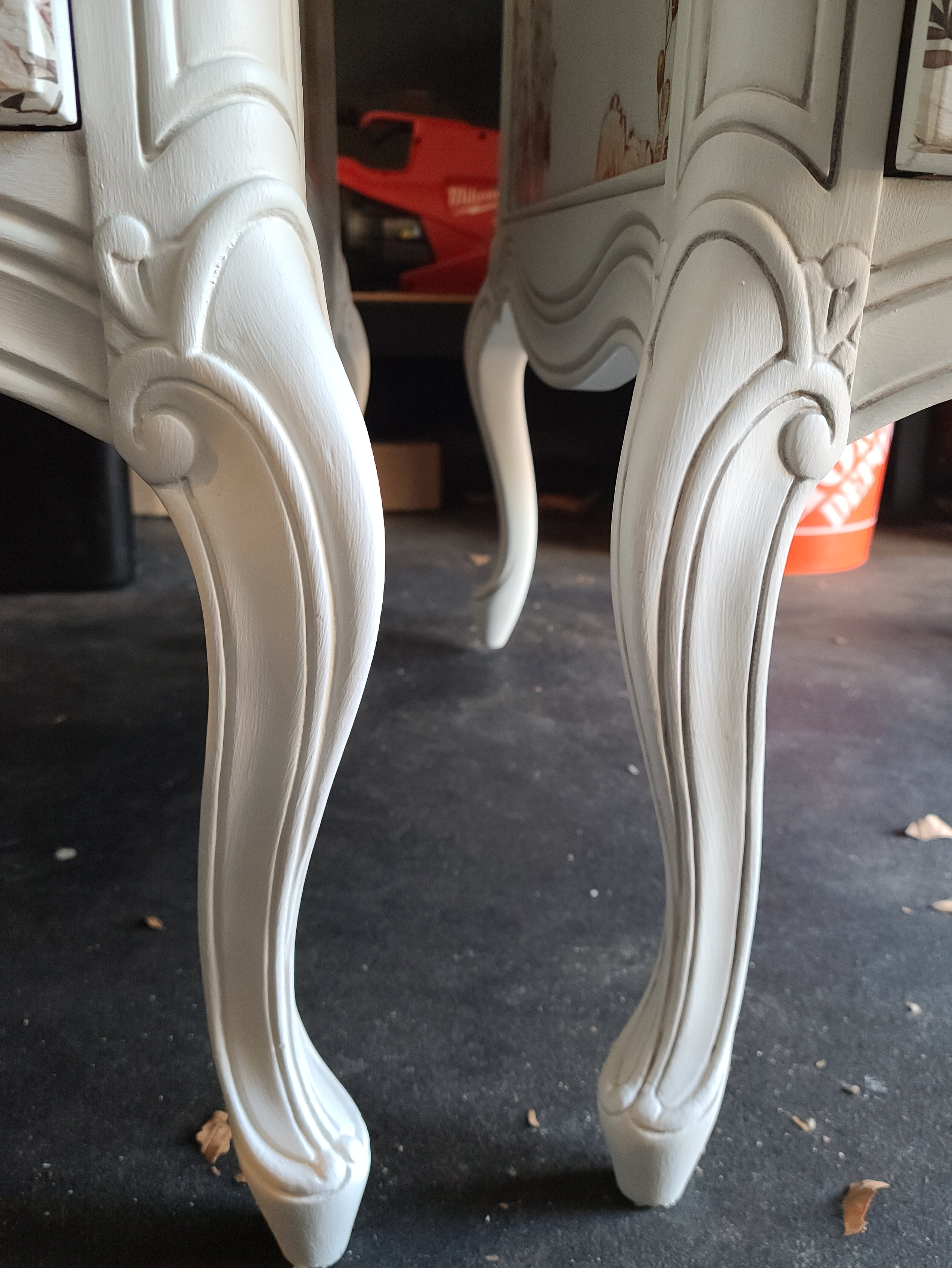Next was time to bring all those beautiful details out. You can use glaze to do this as well but that will darken the entire piece slightly and I just wanted to bring out the details without changing the color. I used Dixie Belle’s Best Dang Wax in black and an artist brush to do this. I used the artist brush to get into the crevices of the pieces and around the indents to create some shadowing. Work in small areas at a time and wipe back as much or as little as you’d like using a cloth. Tip: you can use a baby wipe to remove more of the wax if the cloth isn’t taking enough off. You can see in the photo how much of a difference the wax makes.